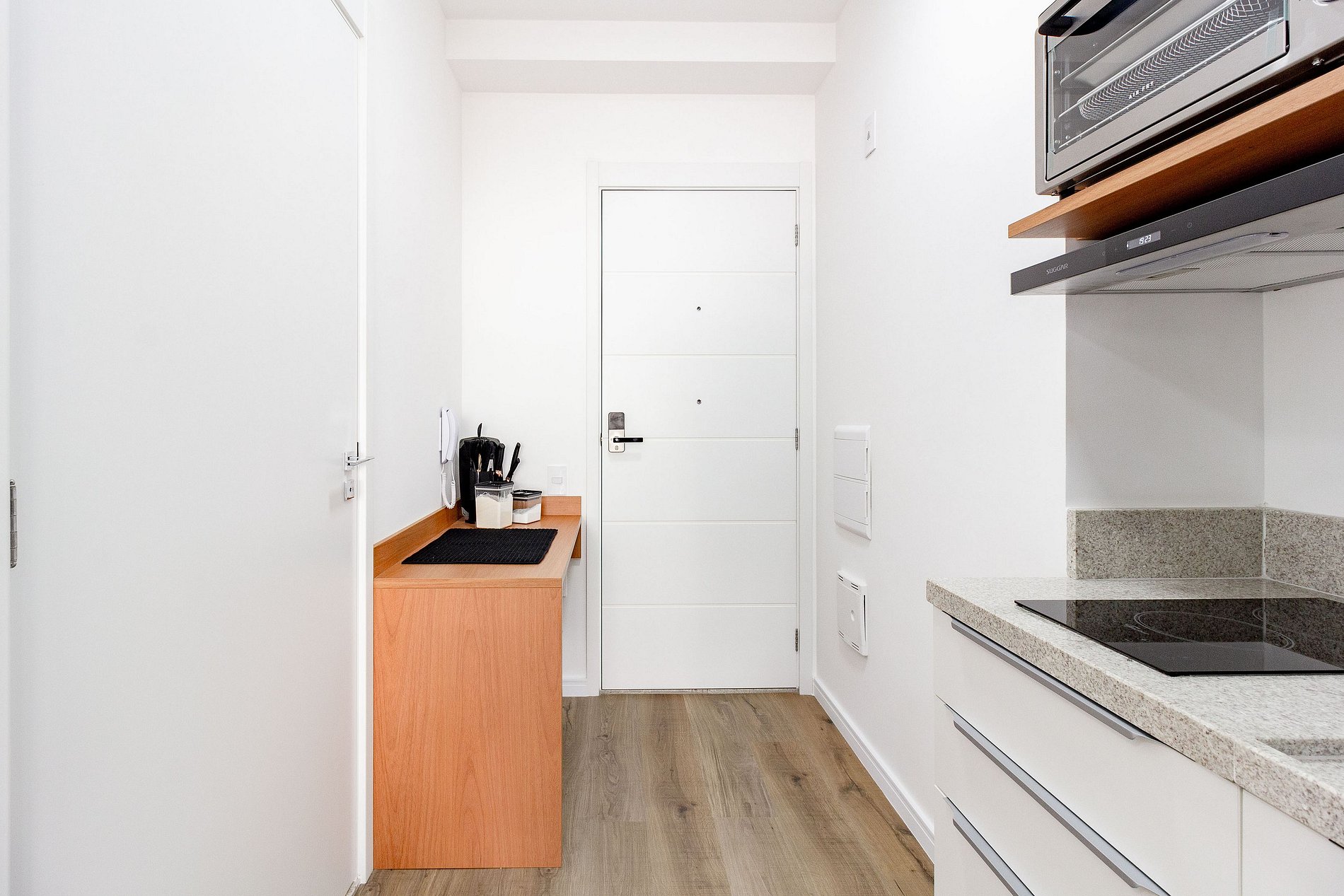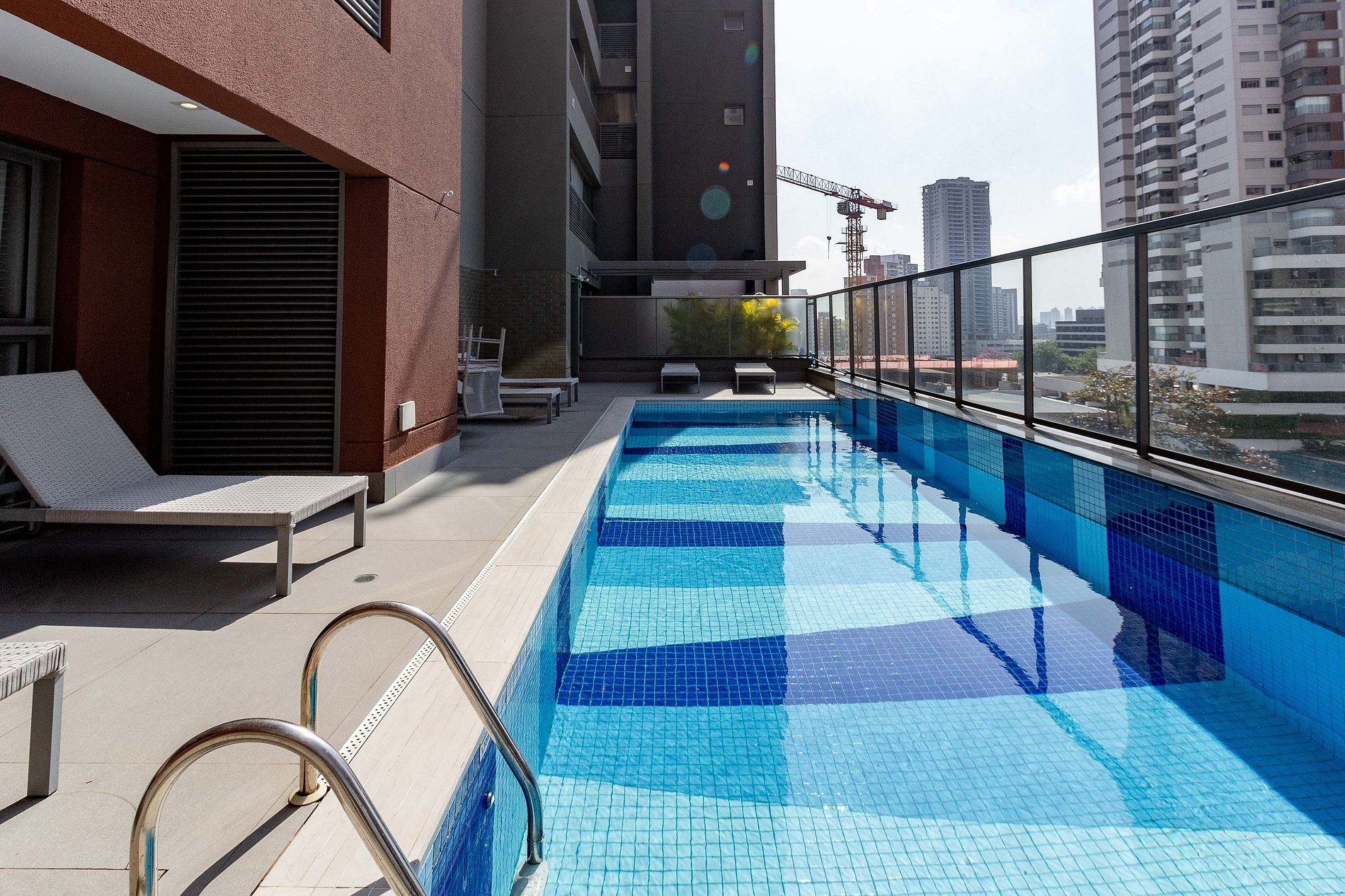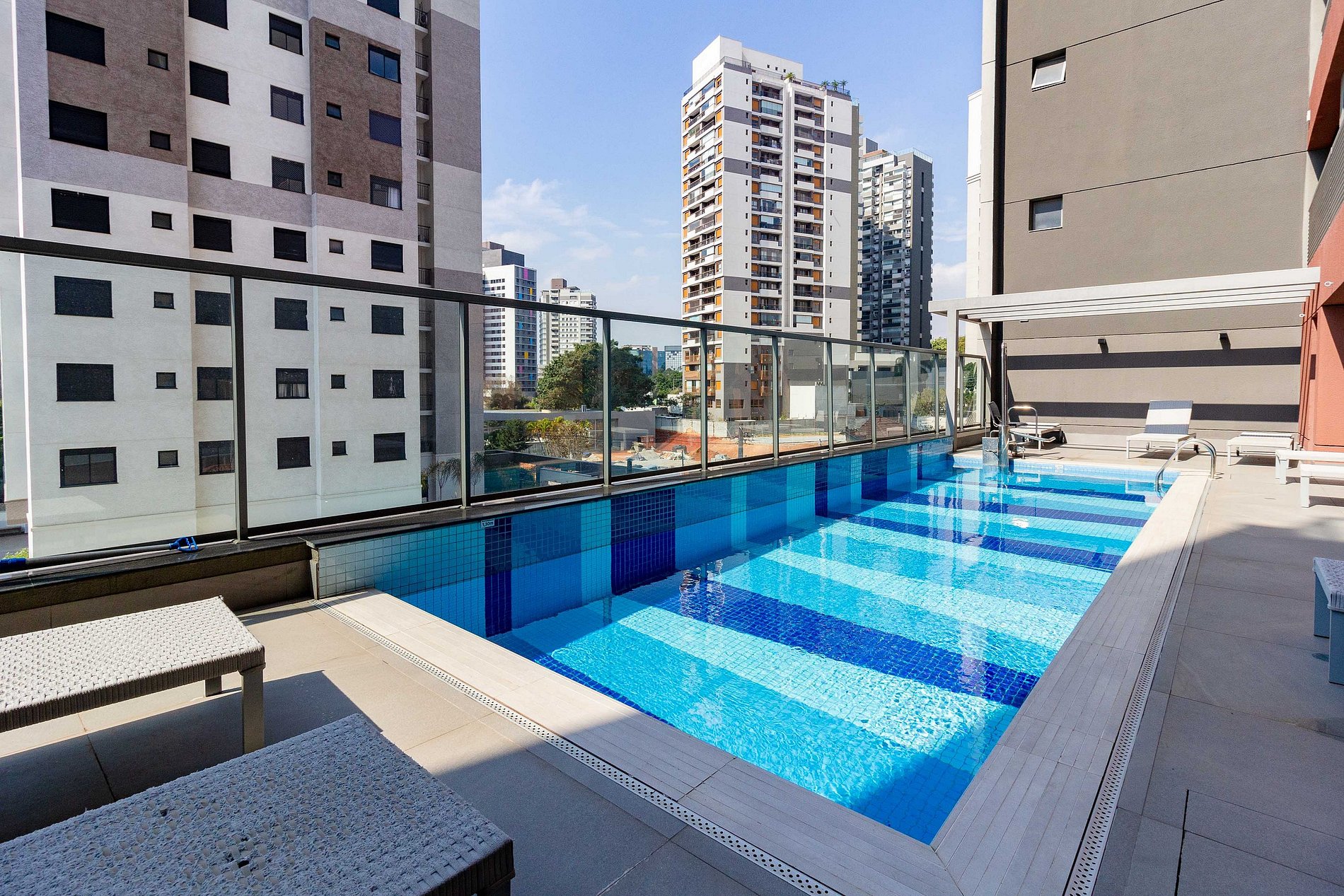 Contamos com portaria 24h, sistema de self check-in, elevadores e espaços de área comum que os hóspedes podem utilizar normalmente, como: academia, piscina, espaço de trabalho e lavanderia OMO.