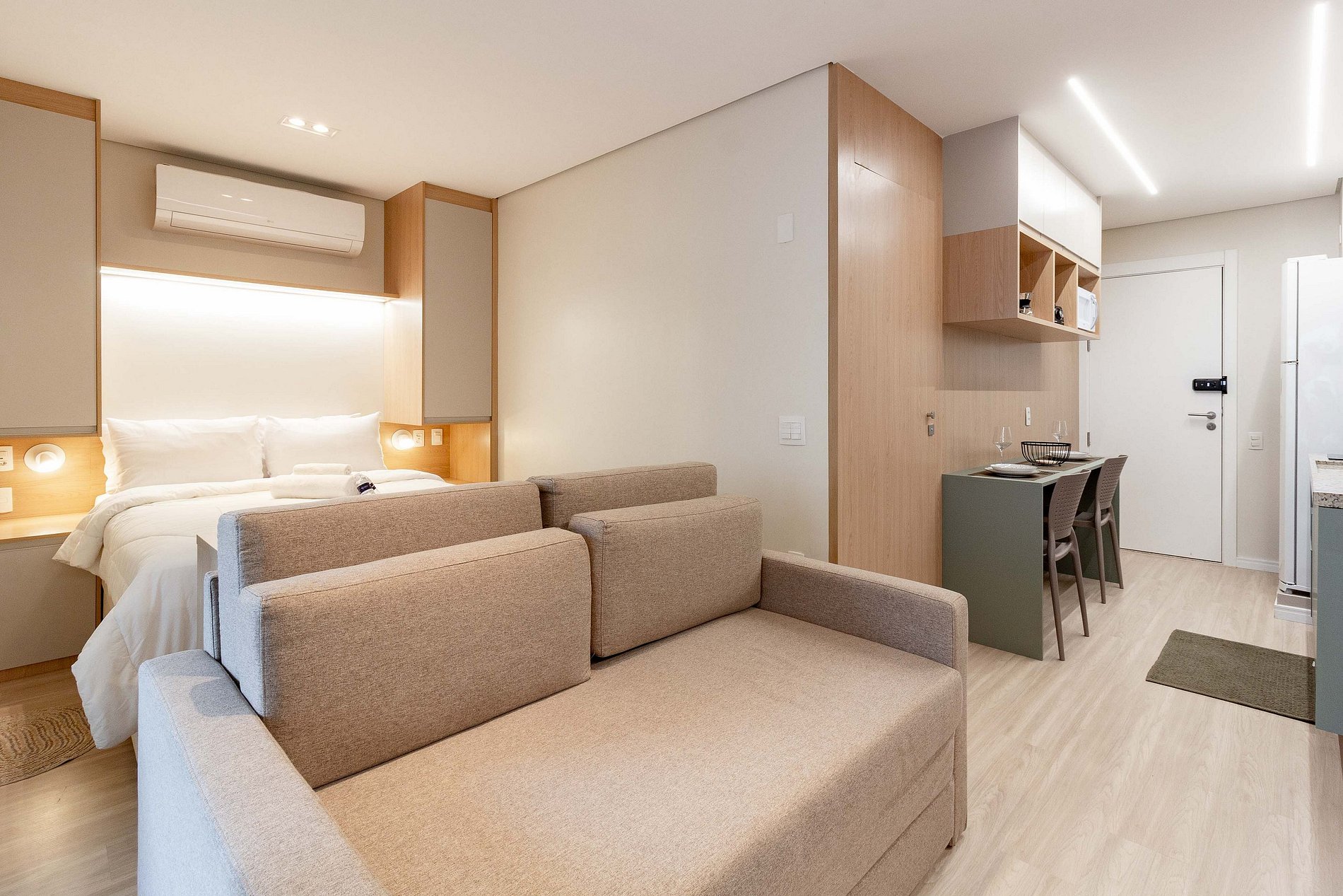 Este estúdio é o encontro perfeito entre o aconchego de um lar e a praticidade de um hotel moderno. Destaques: Autonomia & Conectividade: Cozinha totalmente equipada, Wi-Fi de alta performance, Roupa de cama linha hotel, Ar-condicionado e banheiro totalmente equipado e com toalhas.Localização Privilegiada: Situado em uma rua tranquila e segura, mas a poucos passos de um vibrante polo gastronômico com excelentes bares e restaurantes.