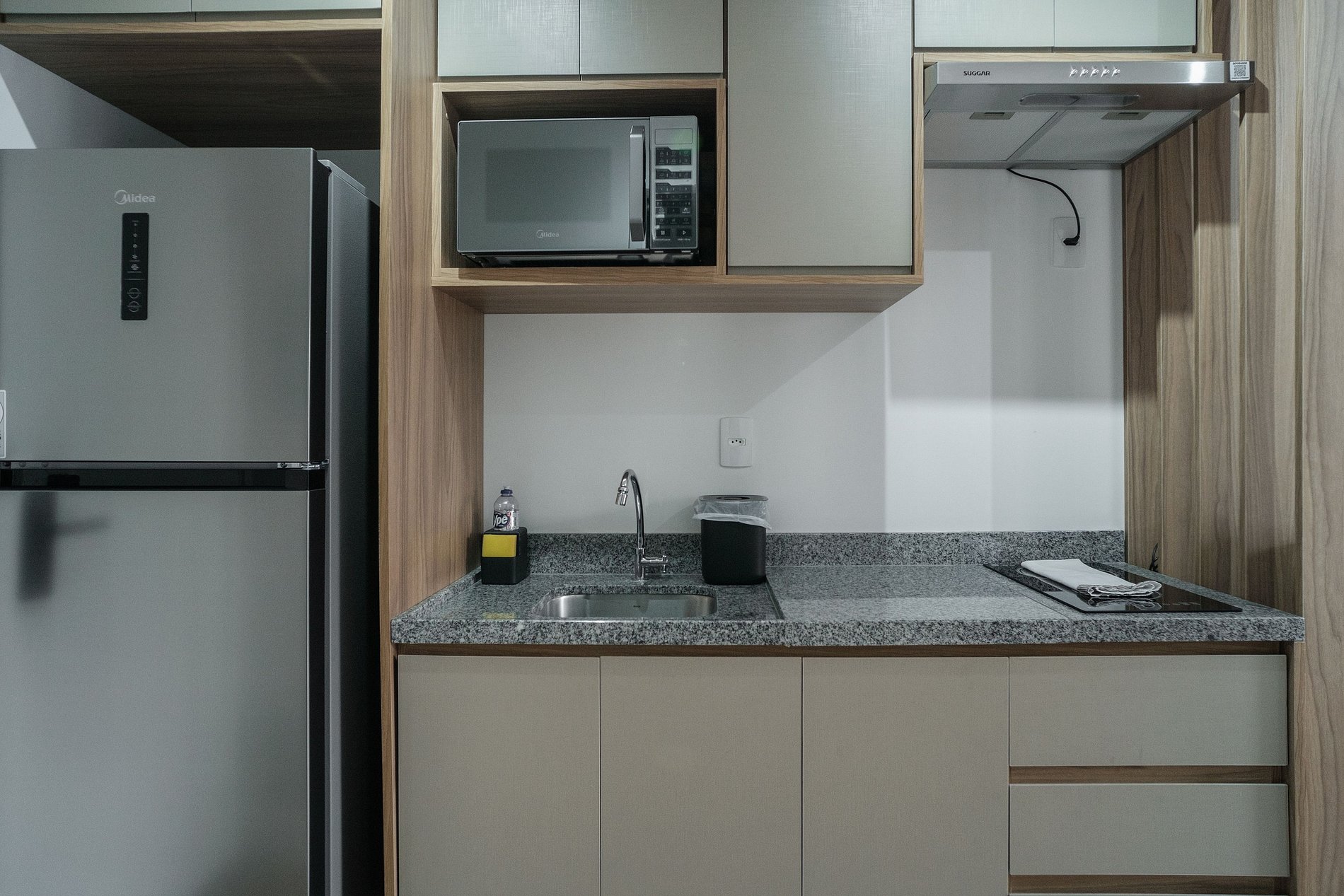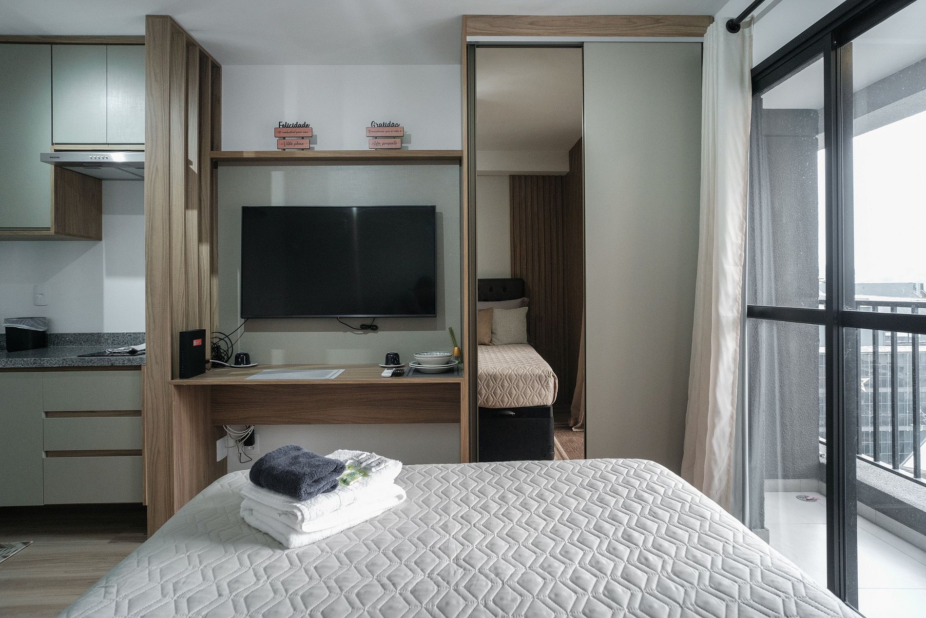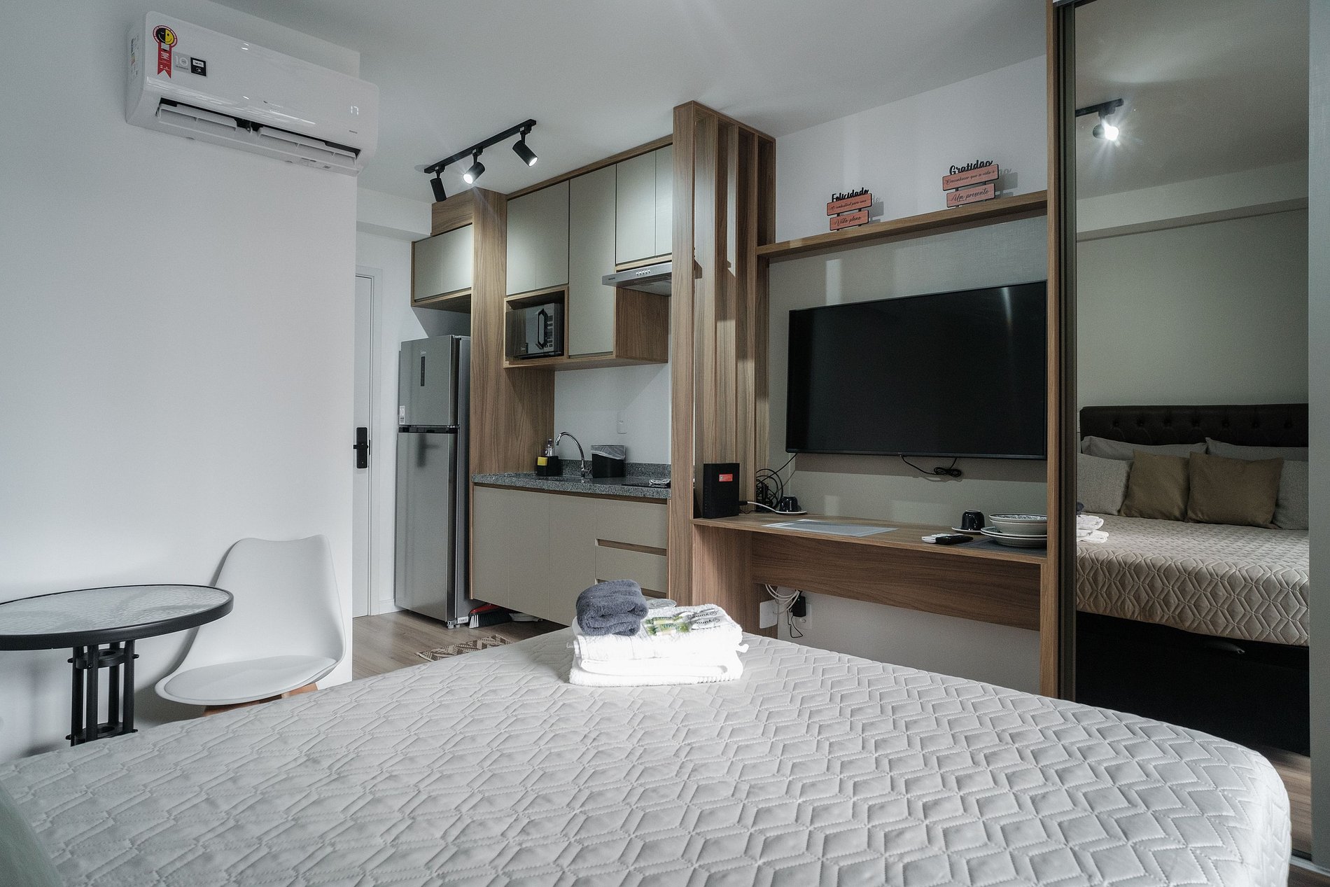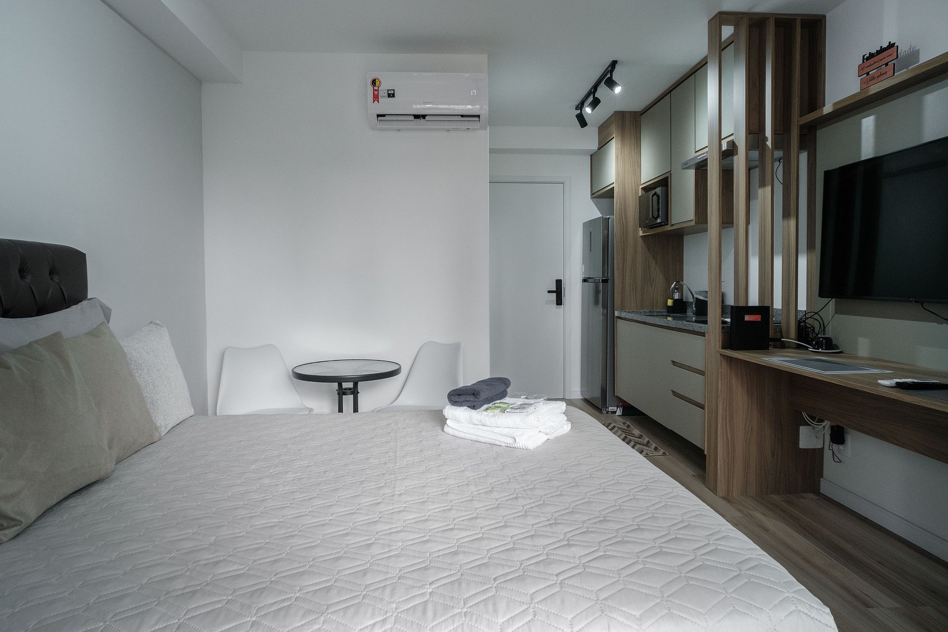 O hóspede encontrará um apartamento completo e com tudo que ele precisa dentro de um quarto: