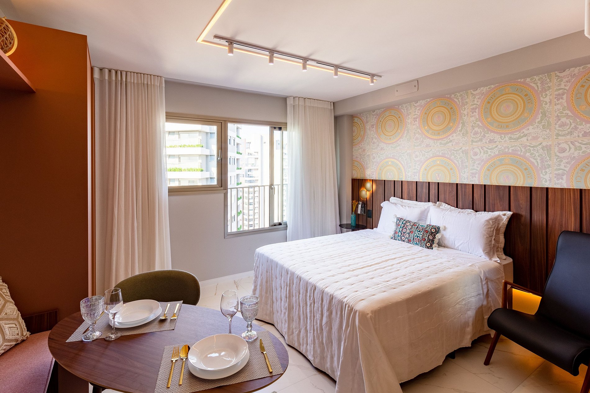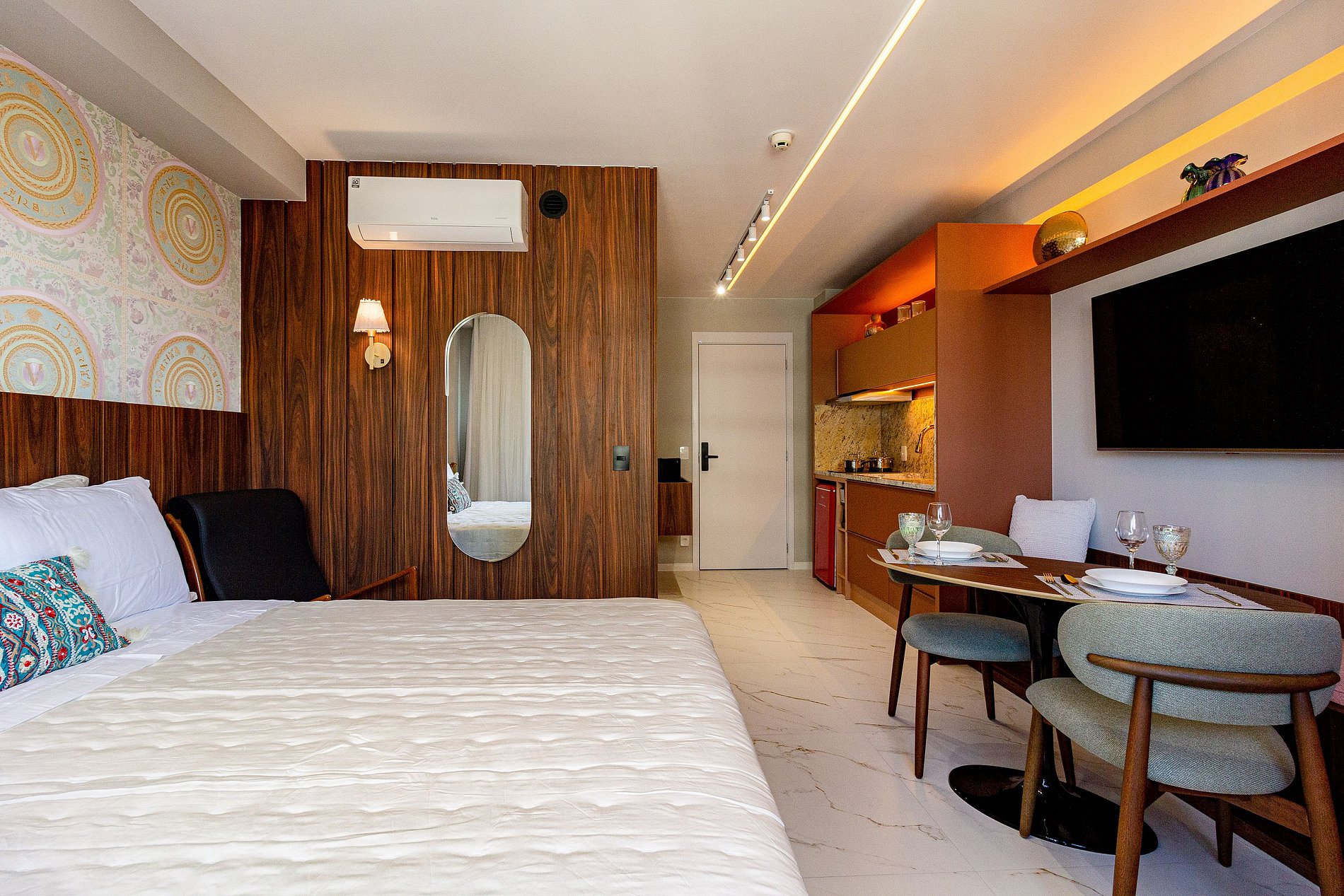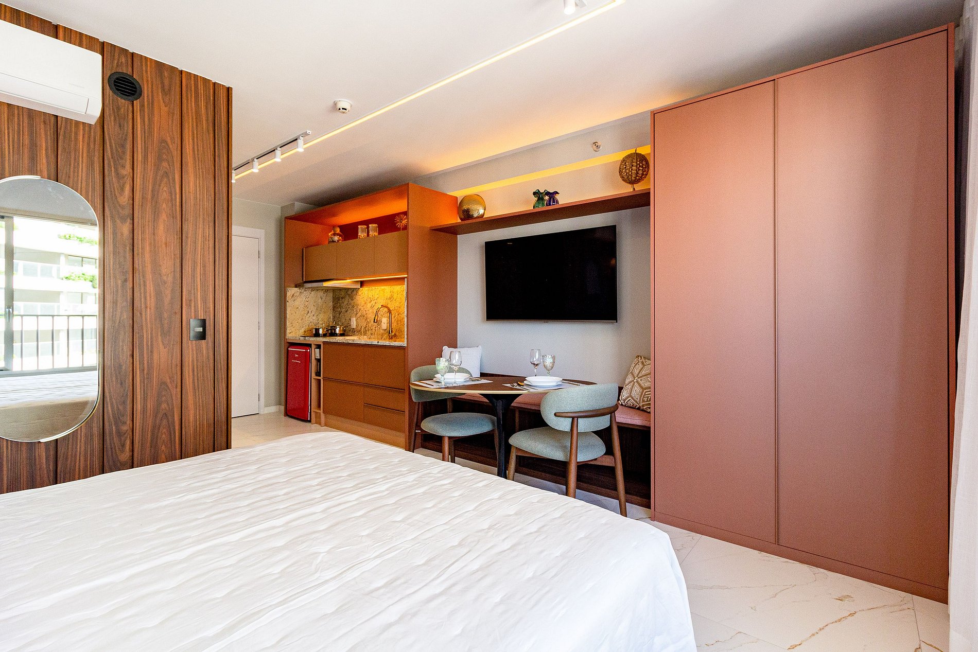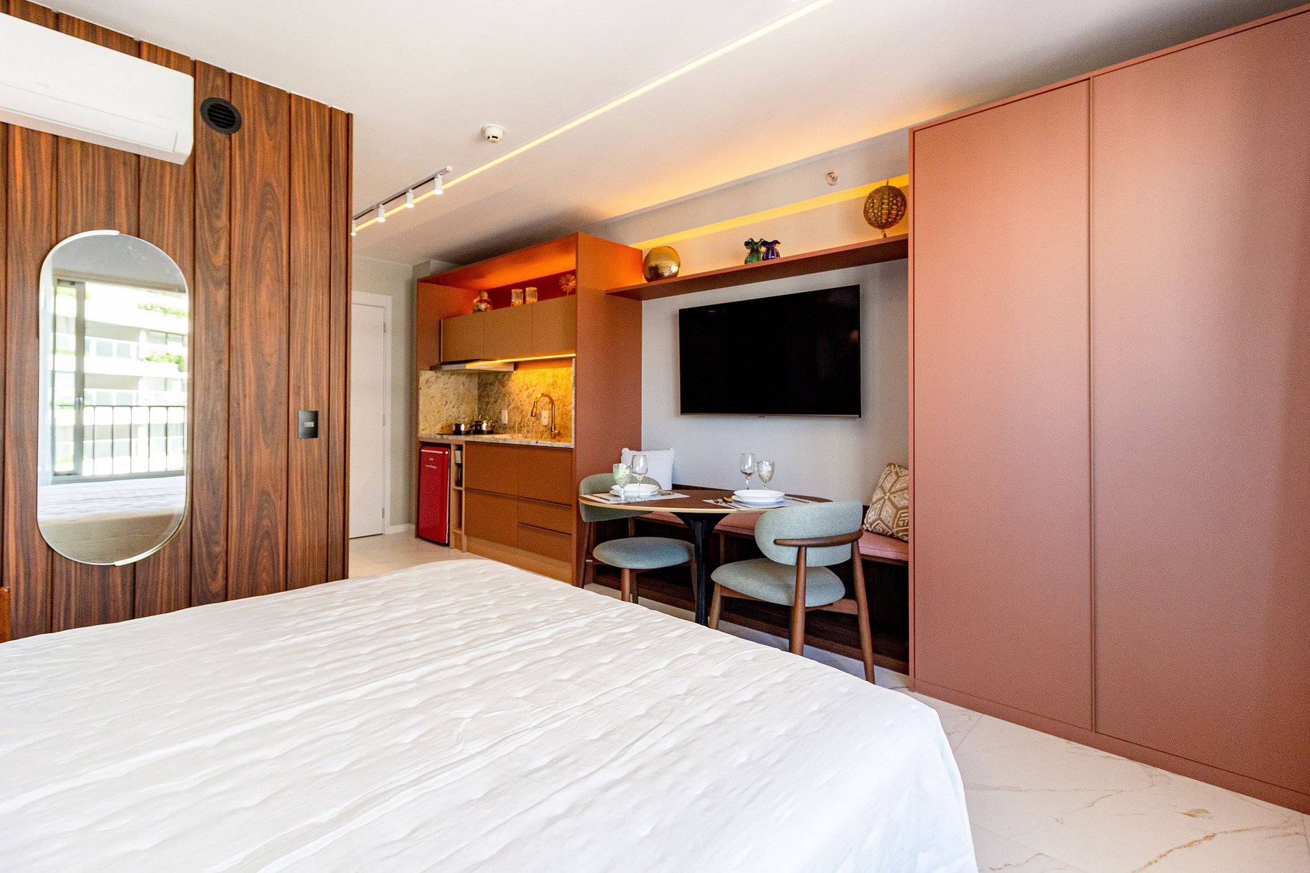 Este studio foi cuidadosamente planejado para oferecer uma experiência sofisticada e funcional em Moema. O ambiente combina design moderno com marcenaria de alto padrão, iluminação aconchegante e excelente aproveitamento de espaço, criando um refúgio urbano elegante e acolhedor.