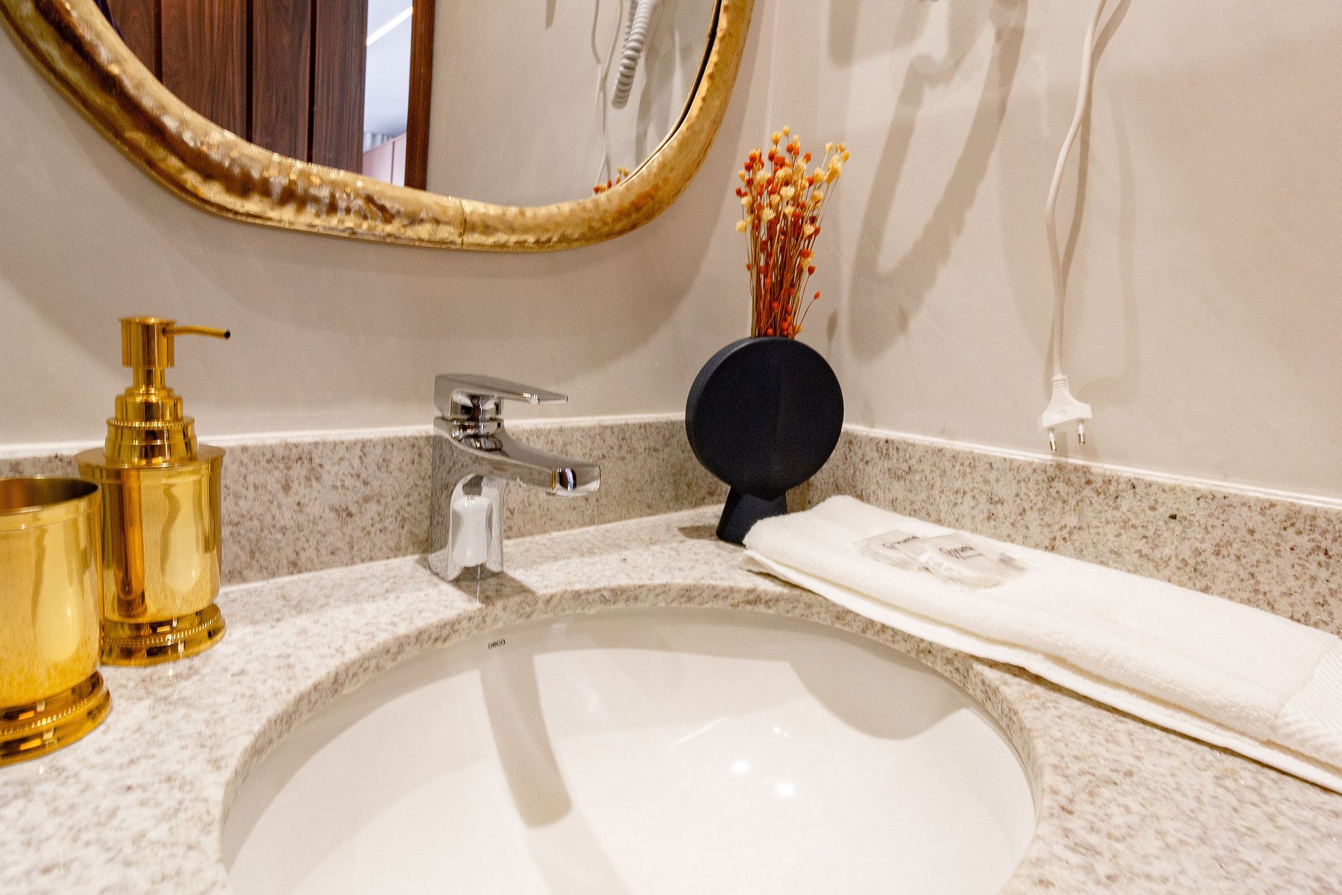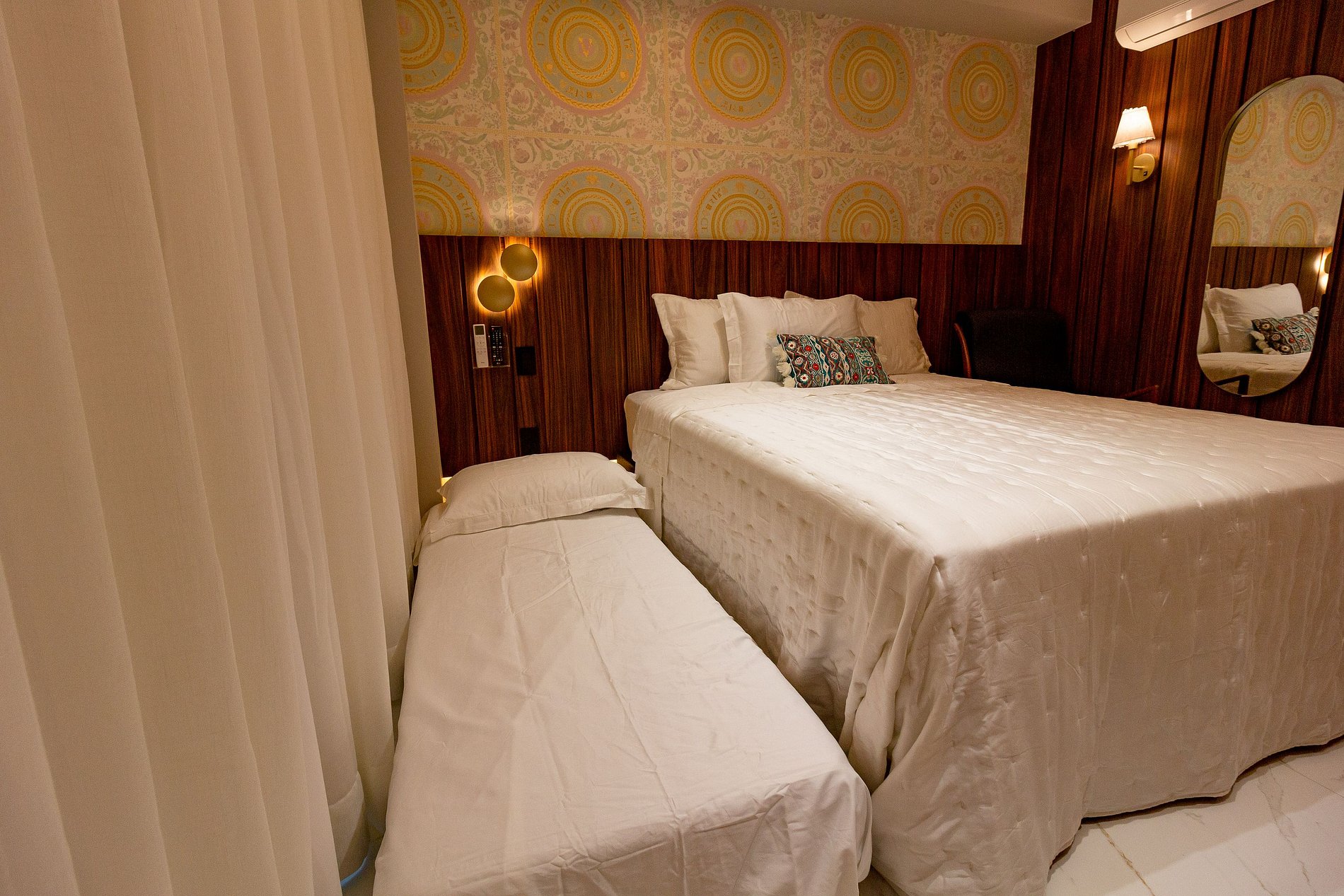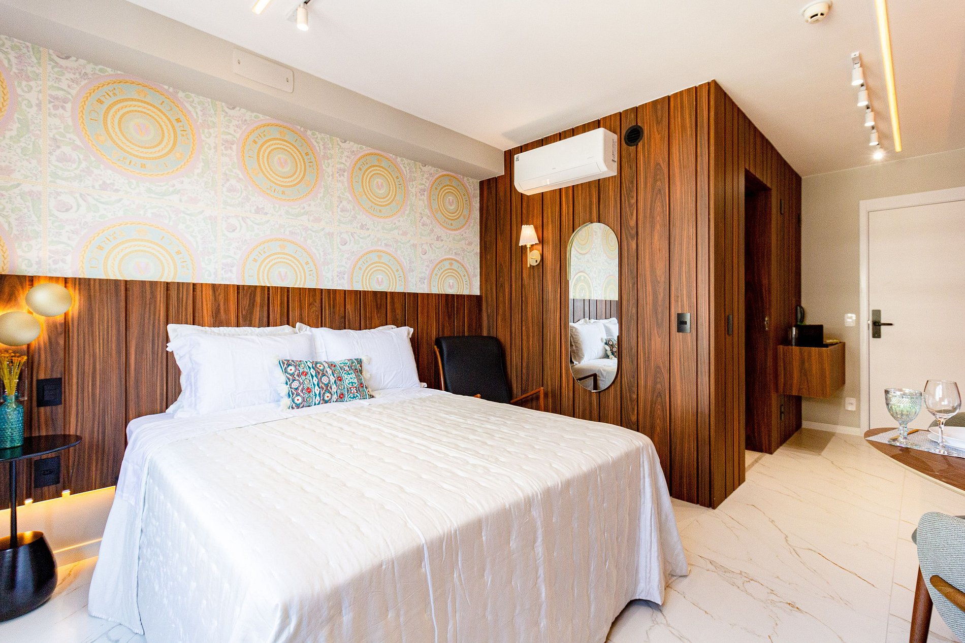 Conforto: Cama queen, ar-condicionado e enxoval premium.