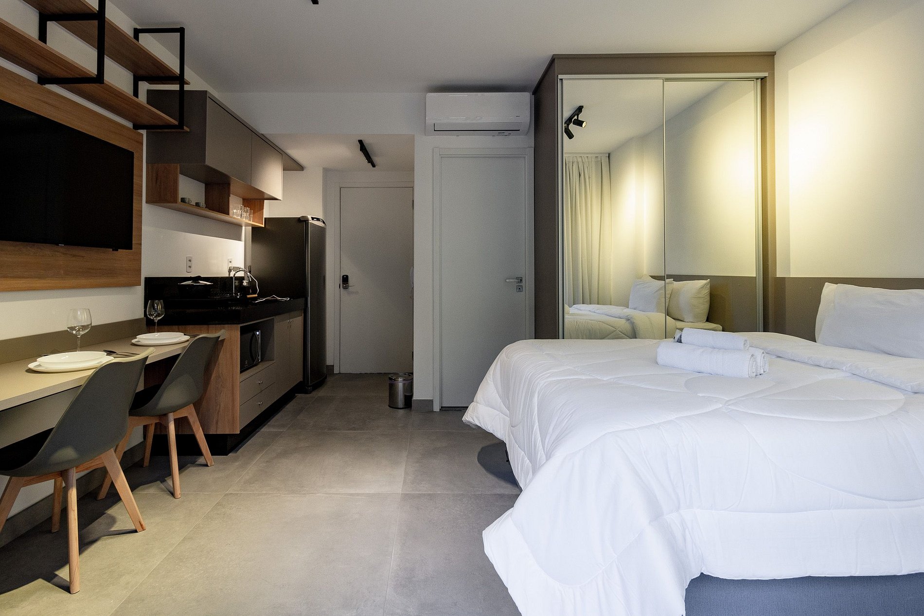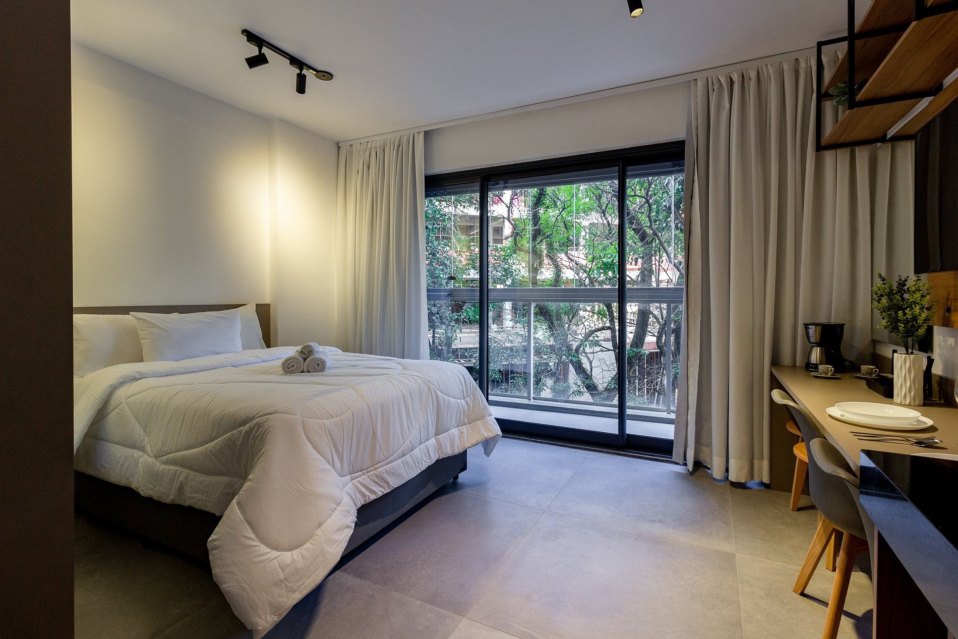 É a opção perfeita para trabalho ou lazer, oferecendo conforto, praticidade e fácil locomoção. O apartamento inclui: cama confortável, enxoval completo (linha hotel), ar-condicionado, Wi-Fi de alta velocidade, cozinha equipada, varanda e banheiro privativo.
