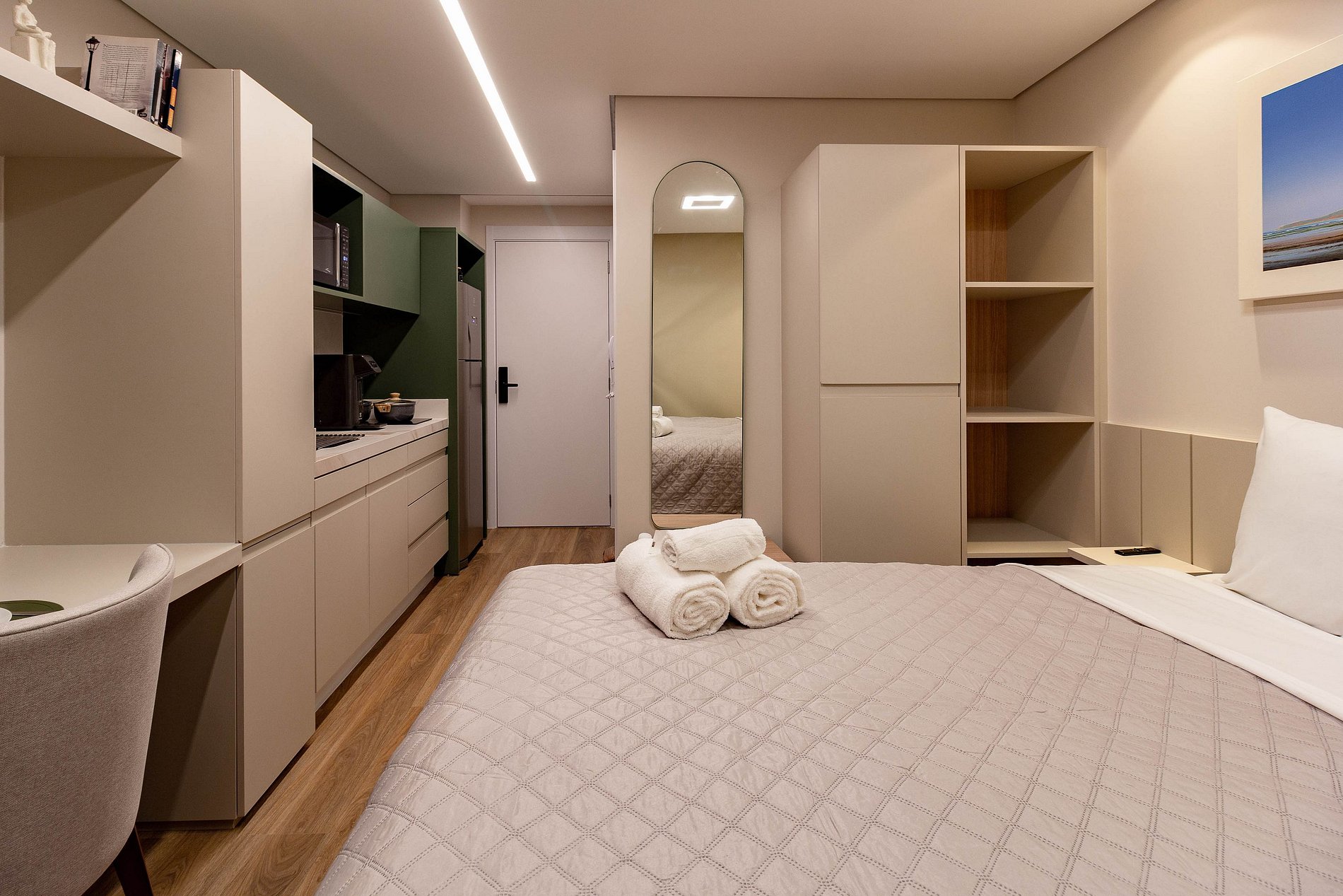 Os hóspedes também poderão utilizar os espaços de área comum do prédio, como: academia, piscina, lavanderia compartilhada e coworking.