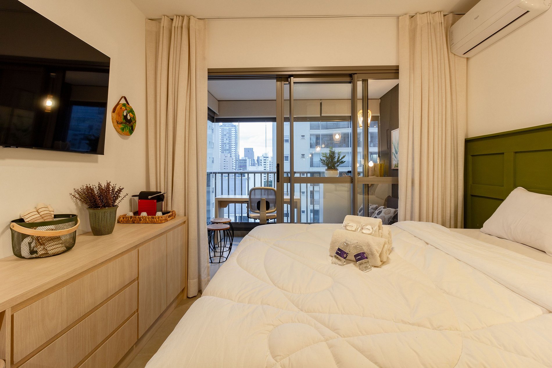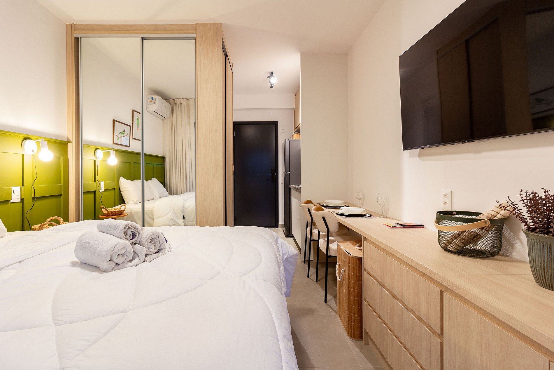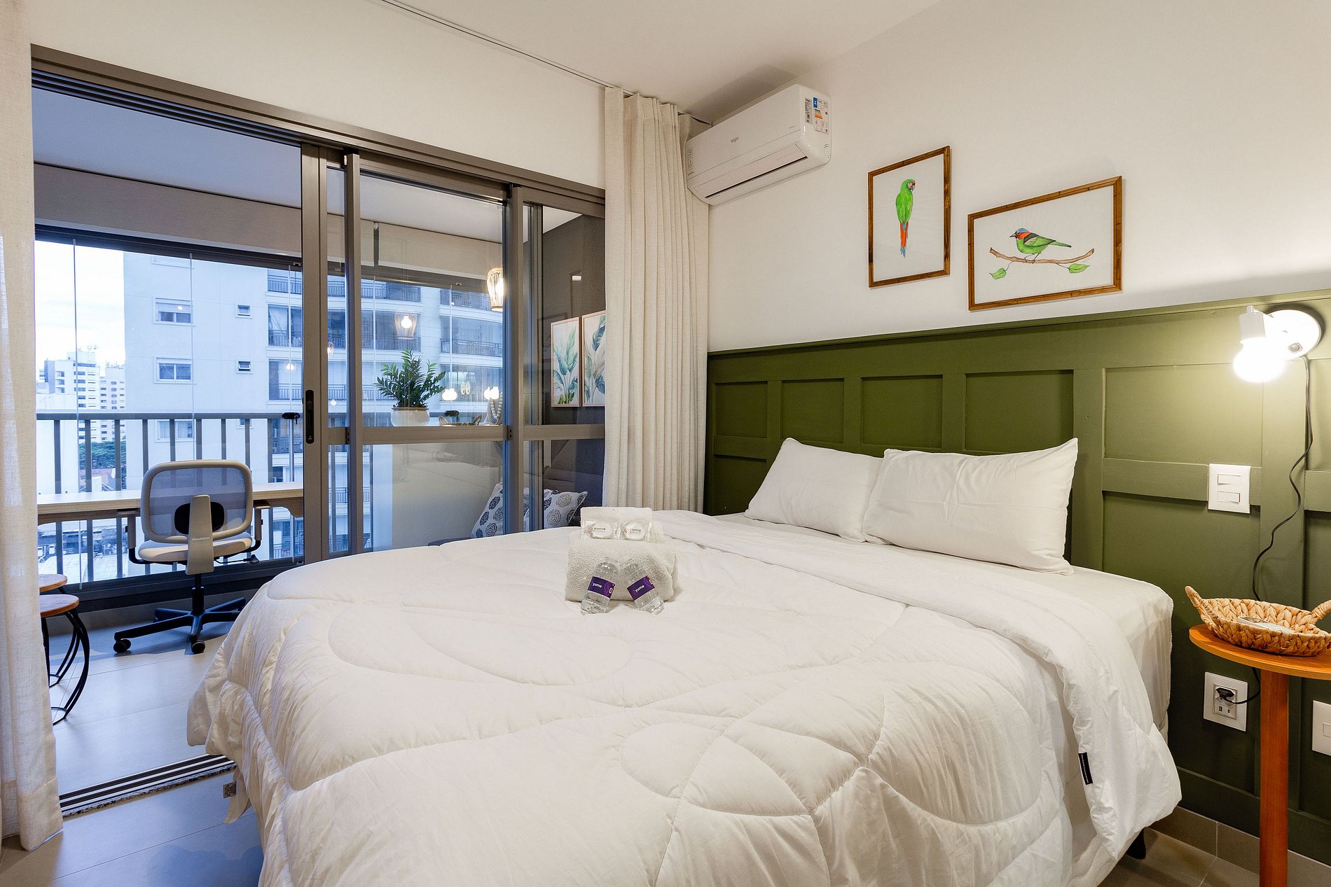 Este apartamento aconchegante oferece vista para áreas verdes, cama queen com enxoval premium, Wi-Fi, Smart TV e cozinha completa.