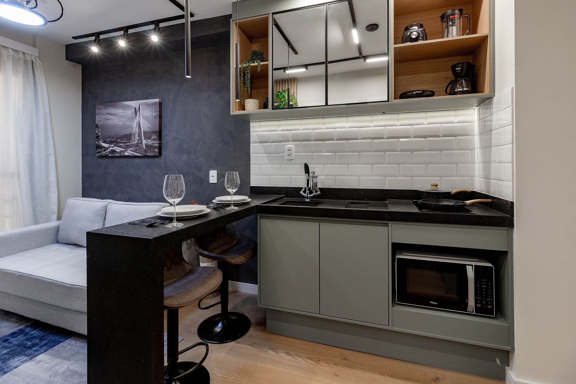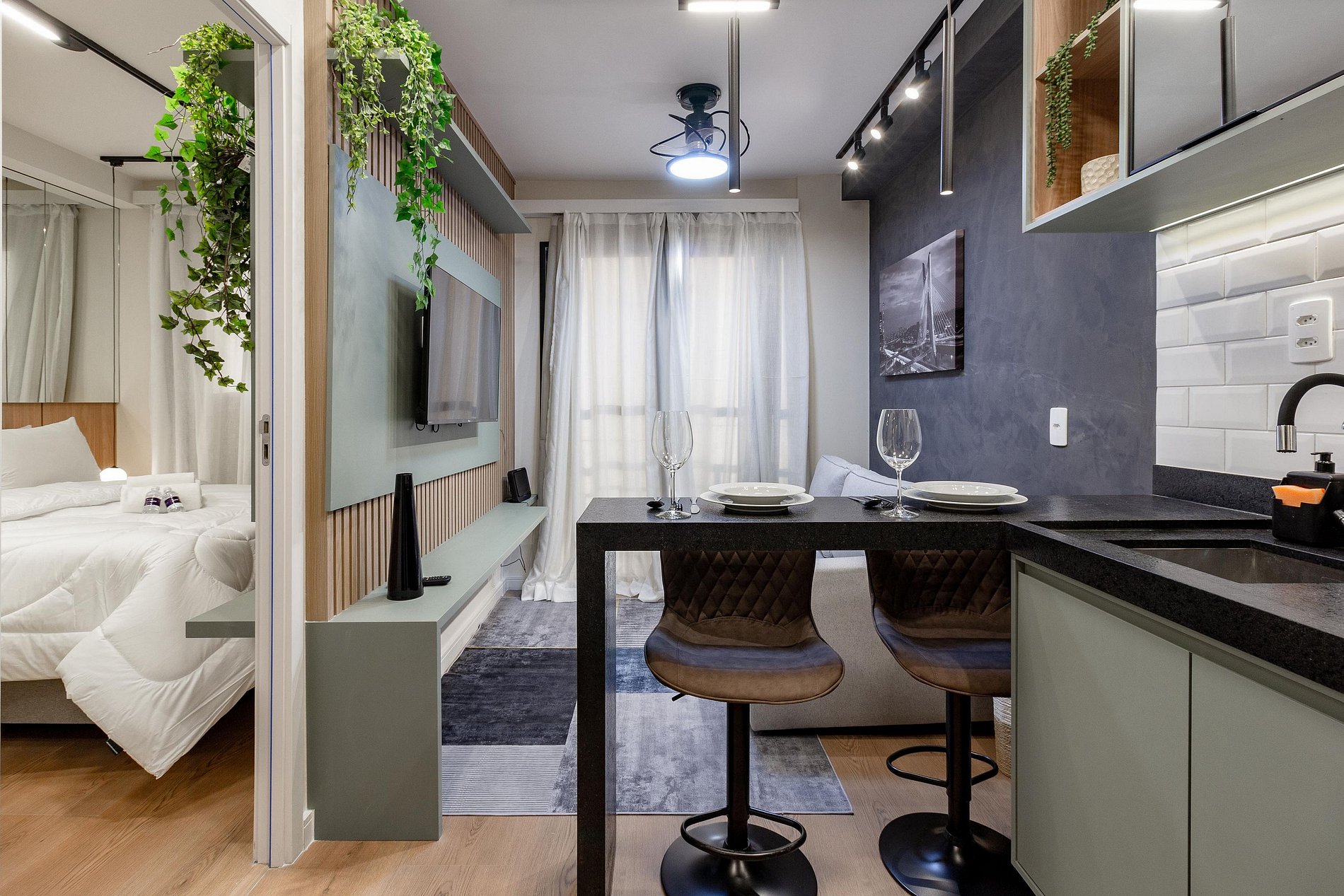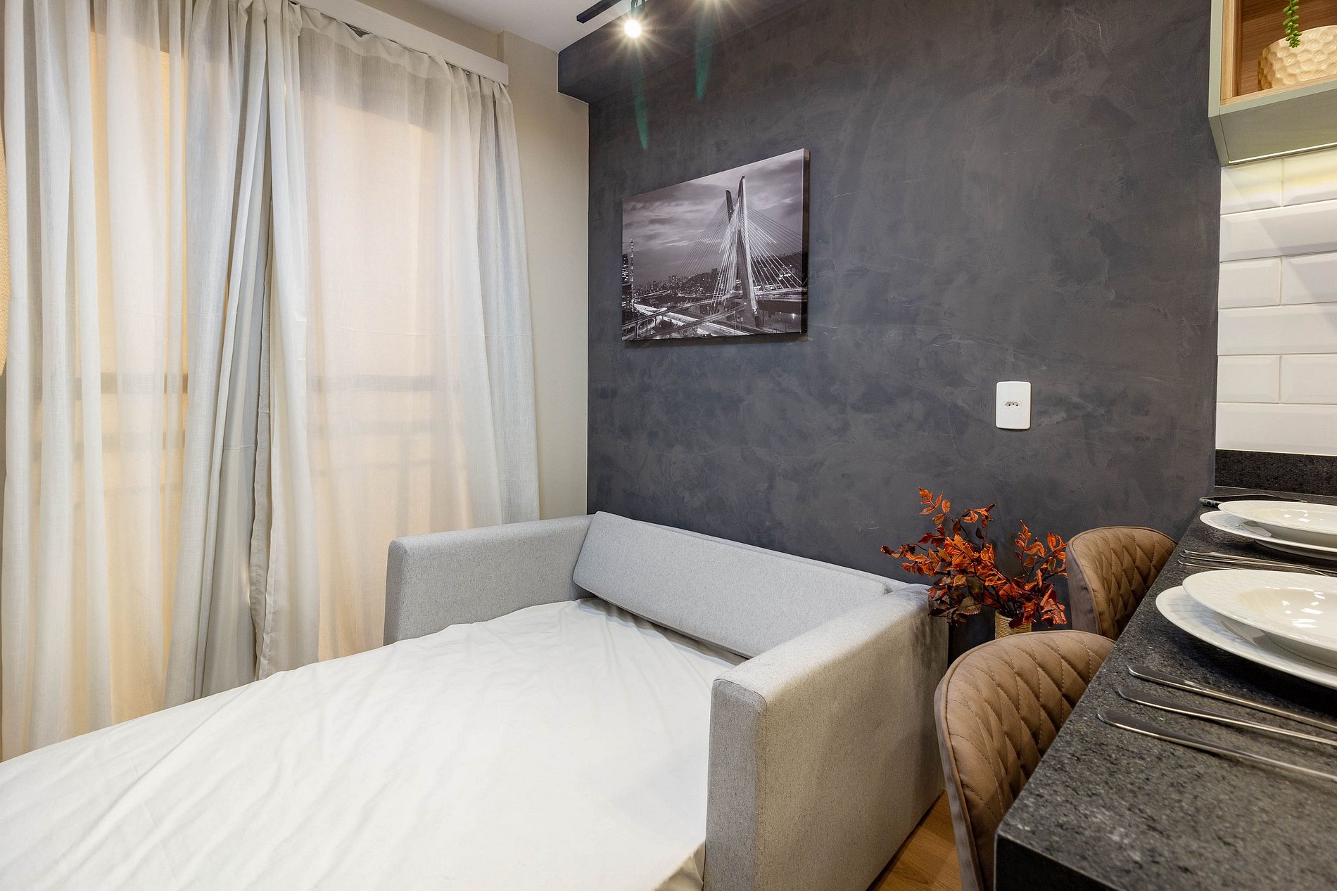 Apartamento moderno e encantador, projetado para quem busca conforto e sofisticação durante uma viagem a trabalho ou a passeio por SP.