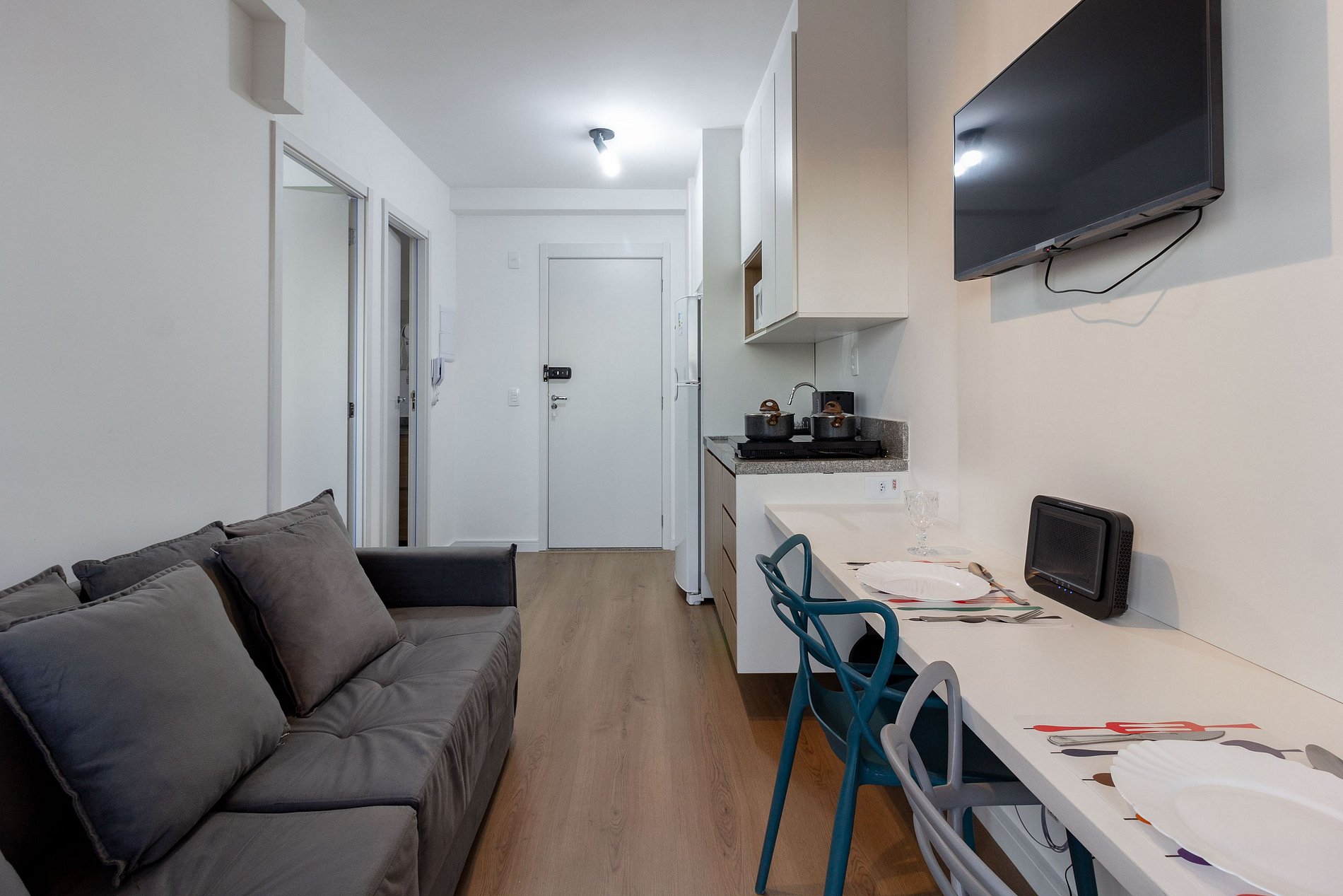Você encontrará o apartamento limpo e idêntico as fotos com: roupa de cama, toalhas, cozinha completa, WI-FI de alta velocidade, TV Smart, ar condicionado, banheiro privativo e com ducha de água quente relaxante e varanda.